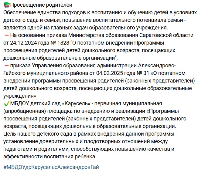 ✔️МБДОУ детский сад «Карусель» - первичная муниципальная (апробационная) площадка по внедрению и реализации «Программы просвещения родителей (законных представителей) детей дошкольного возраста, посещающих дошкольные образовательные организации. В 2025 году программа реализуется в старшей и подготовительной группах детского сада.