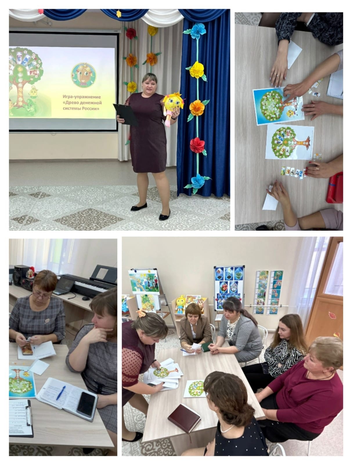 Воспитатель детского сада Аделова Ольга Андреевна организовала с участниками семинара игру «Древо денежной системы России» и вместе с феей Копеечкой рассказала, как устроена денежная система нашей страны.