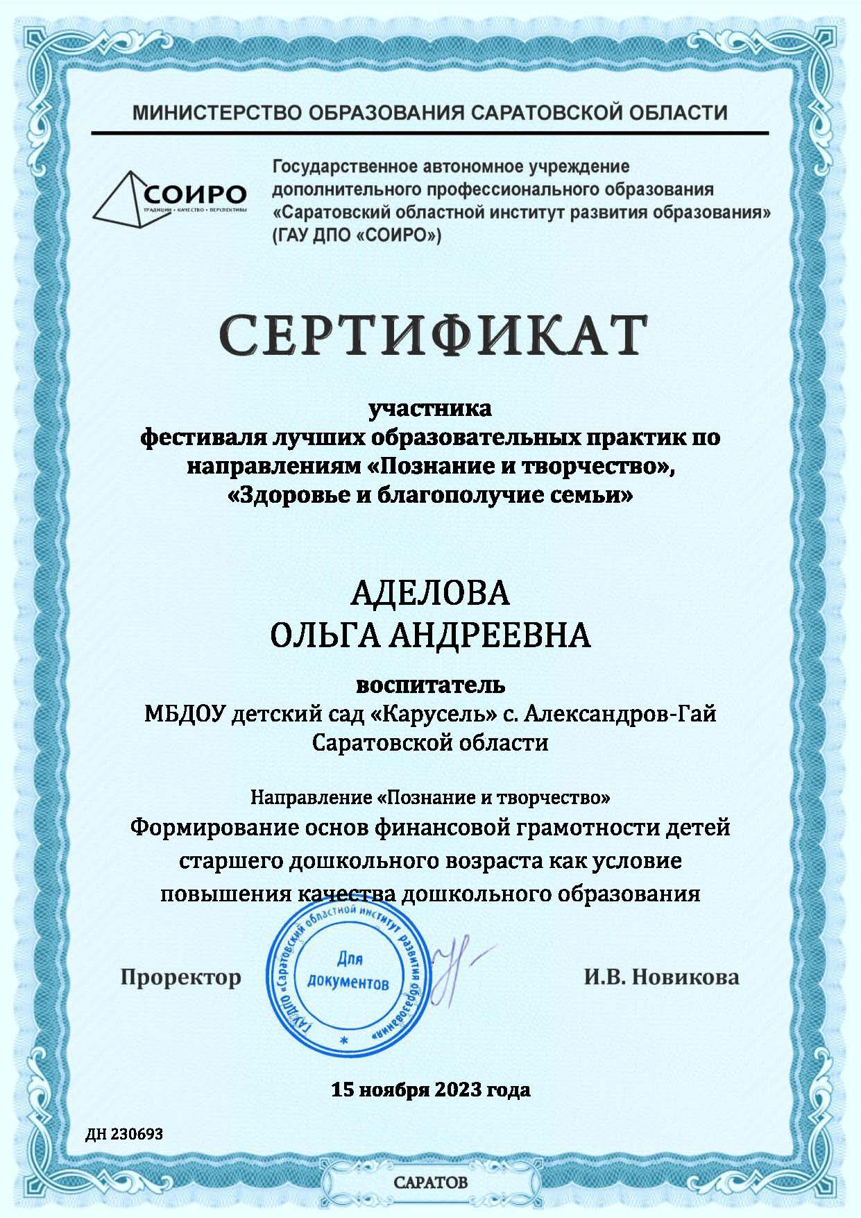 Повышение квалификации ГАУ ДПО «СОИРО», «Актуальные вопросы управления дошкольной образовательной организацией в условиях реализации ФГОС ДО и введения ФОП ДО», 2023 год.