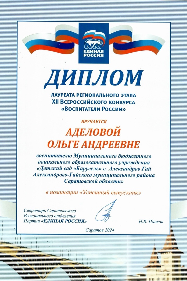 | Председатель первичной профсоюзной организации МБДОУ детский сад "Карусель" с. Александров-Гай воспитатель Аделова Ольга Андреевна участвовала в областном конкурсе"Лидер в Профсоюзе -2023".#ЛидервПрофсоюзе2023Саратов. https://vk.com/wall597958027_84 |