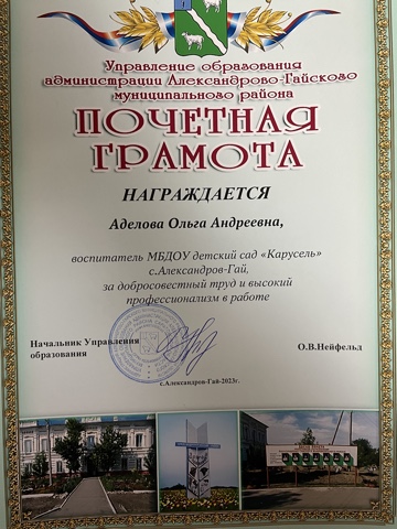 | Председатель первичной профсоюзной организации МБДОУ детский сад "Карусель" с. Александров-Гай воспитатель Аделова Ольга Андреевна награждена почётной грамотой за добросовестное отношение к работе, активное участие в общественной жизни. Грамота вручена на торжественном открытии Года педагога и наставника. | Председатель первичной профсоюзной организации МБДОУ детский сад "Карусель" с. Александров-Гай воспитатель Аделова Ольга Андреевна награждена почётной грамотой Саратовской областной организацией Профессионального союза работников народного образования и науки РФ за активную работу в Профсоюзе. |