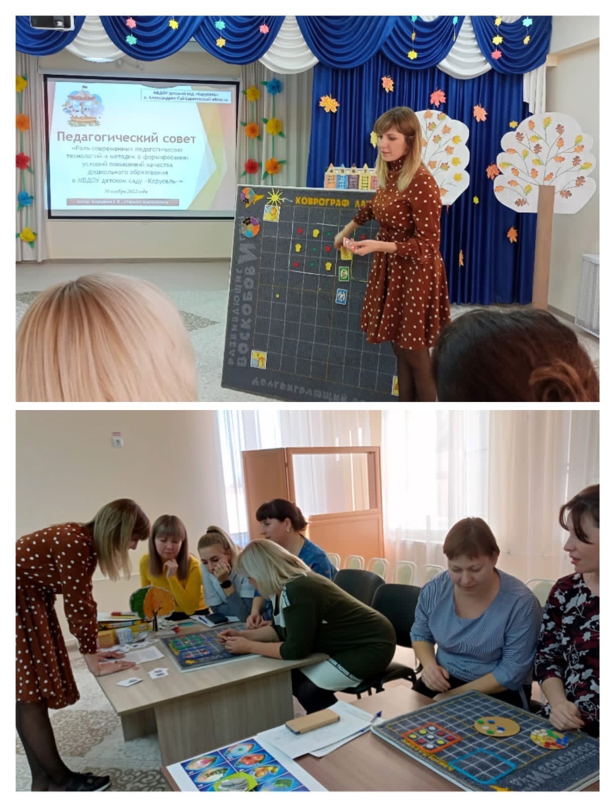 На практико-ориентированном педагогическом совете педагоги приняли участие в экспресс-опросе, поработали с таблицами и определили название технологий по описанию, продемонстрировали практическое применений современных технологий и методик: Коблова Т.А. (развивающие технологии в работе с детьми с ОВЗ); Савинкова Н.В. (развивающие игры В.В. Воскобовича); Жумалиева В.Ю. (игры нового поколения по формированию финансовой грамотности воспитанников); Касимова О.П. (игровые технологии в обучении грамоте и математике) и активно участвовали в предложенных играх, игровых упражнениях и игровых ситуациях.